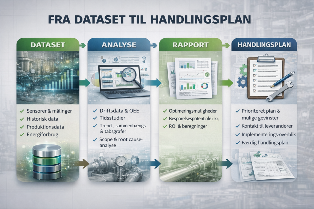 Analyse af kundens eksisterende drifts- og procesdata. Resultaterne samles i en overskuelig rapport med dokumenterede forbedrings- og besparelsesmuligheder.